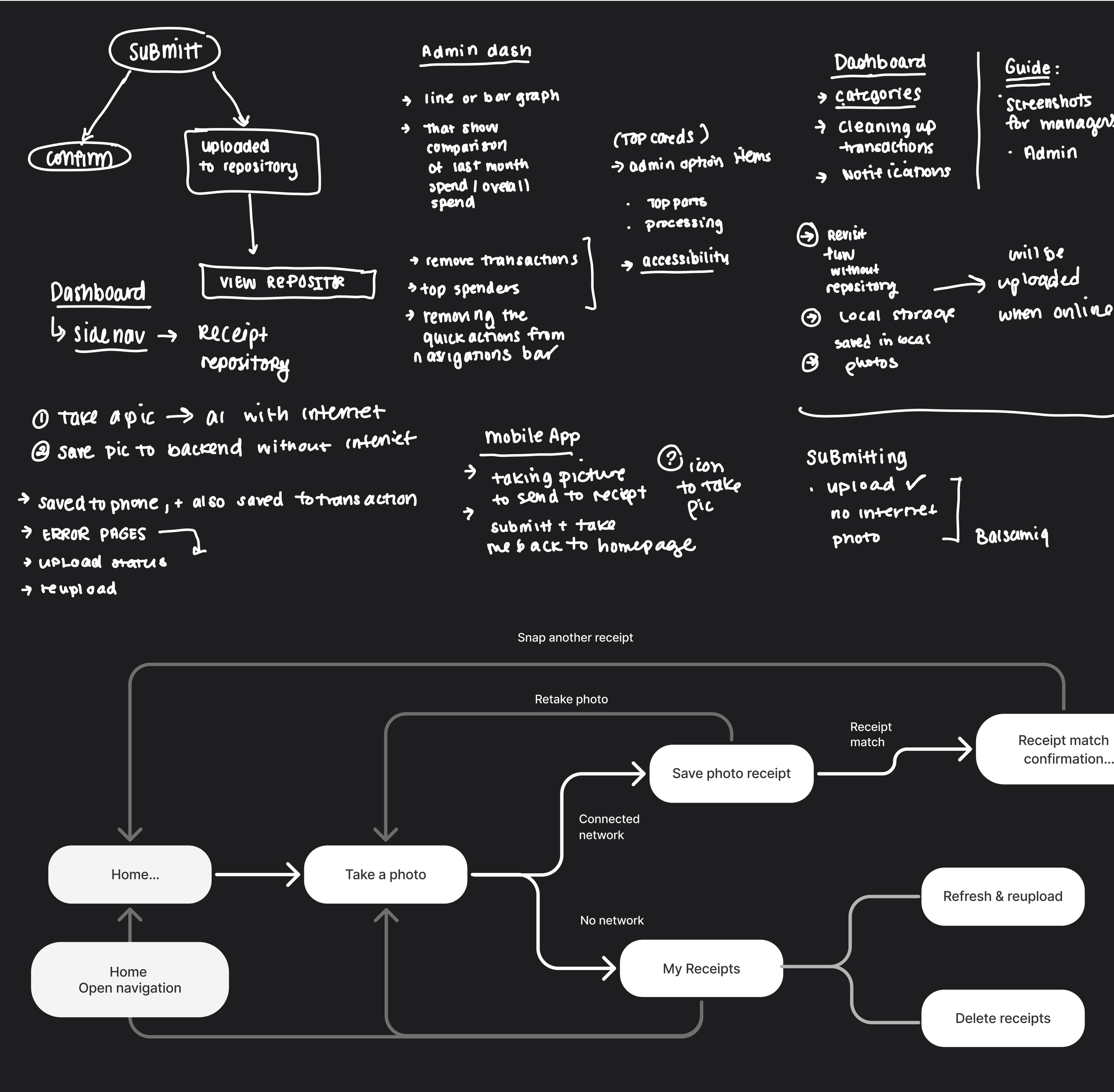 The design process included brainstorming and mapping the receipt submission flow to enhance user efficiency and ensure seamless offline functionality.